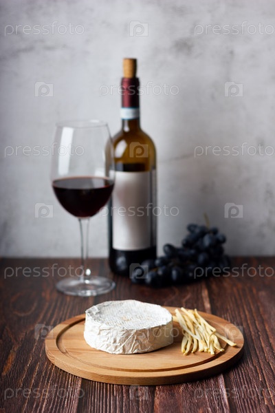 Натюрморт с вином, сыром и виноградом на деревянном столе