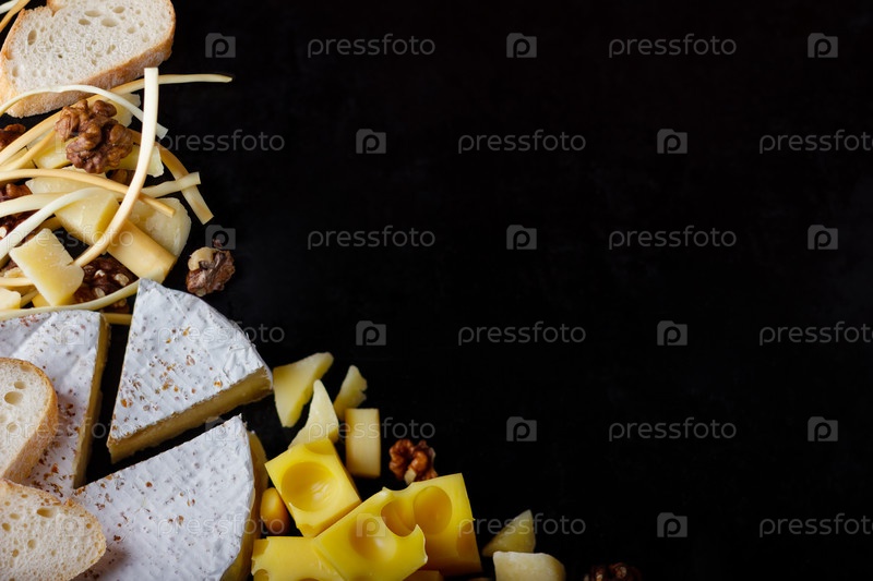Ассортимент сыров и грецких орехов на черном столе. Вид сверху. Пространство для вас текст
