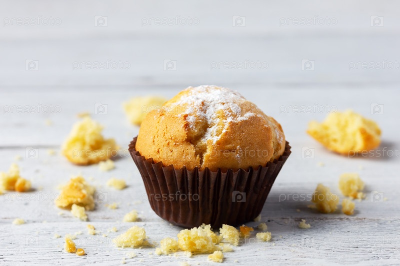 Свежеиспеченный кекс на деревянном белом фоне с копией пространства