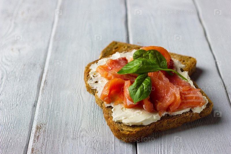 Сэндвич с копченым лососем и сливочным сыром. Концепция здорового питания