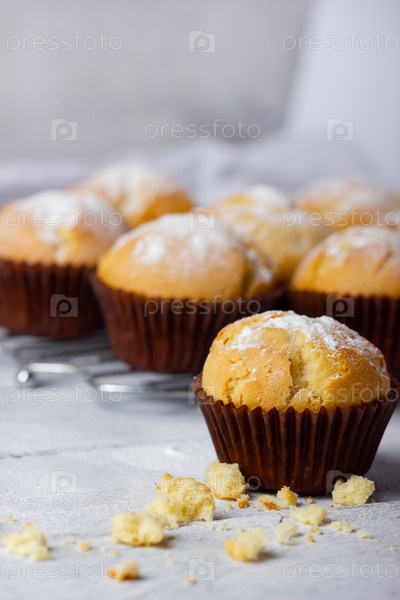 Вкусный сладкий завтрак, домашняя выпечка. Свежеиспеченные домашние кексы в коричневых бумажных стаканчиках