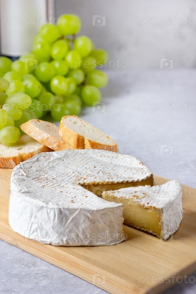Камамбер с зеленым виноградом и винной бутылкой. Выбор закуски