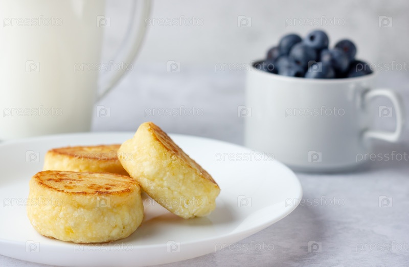 Сырники со свежей черникой и молоком. Домашняя еда. Здоровый завтрак
