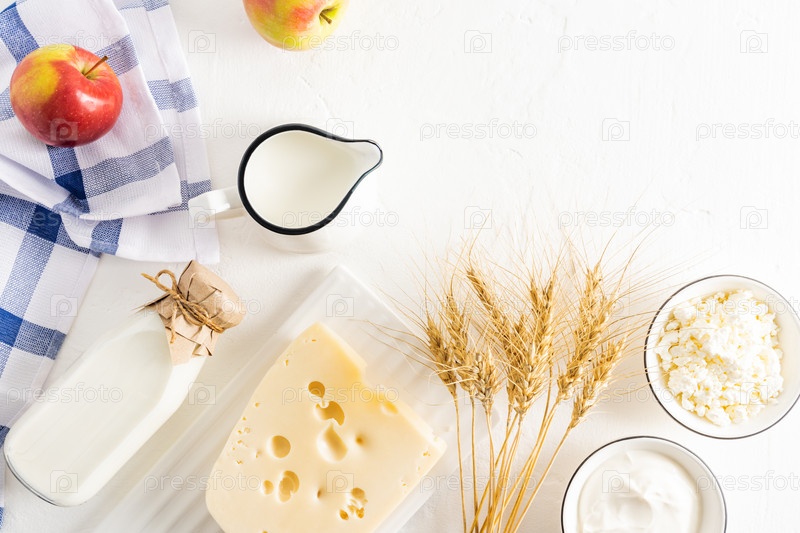Концепция еврейского праздника Шавуот с молочными продуктами, фруктами, сыром, бутылкой молока на белом столе. Плоская планировка, вид сверху