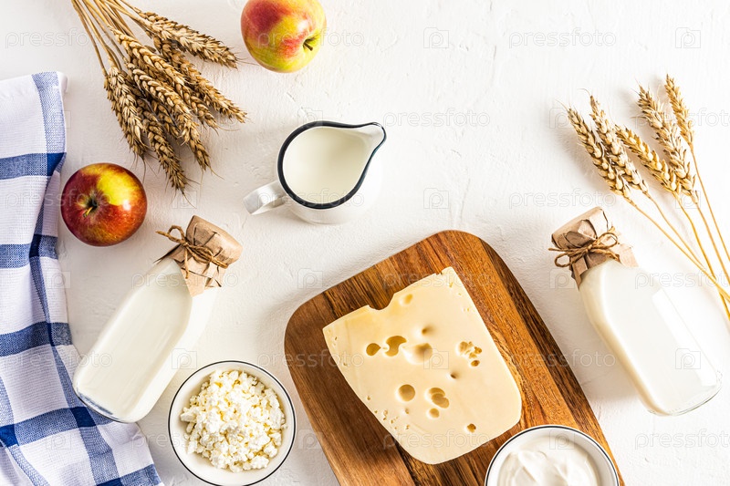 Различные молочные продукты в бутылках, мисках, на доске на белом фоне с ушами. вид сверху. праздничный фон для еврейского праздника Шавуот