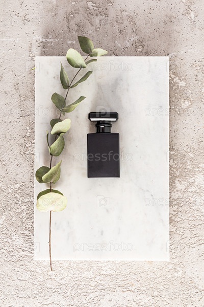 Вертикальный вид элегантной черной матовой бутылки мужской косметики или спрея на прямоугольном куске мрамора. серый бетонный фон. безымянный флакон