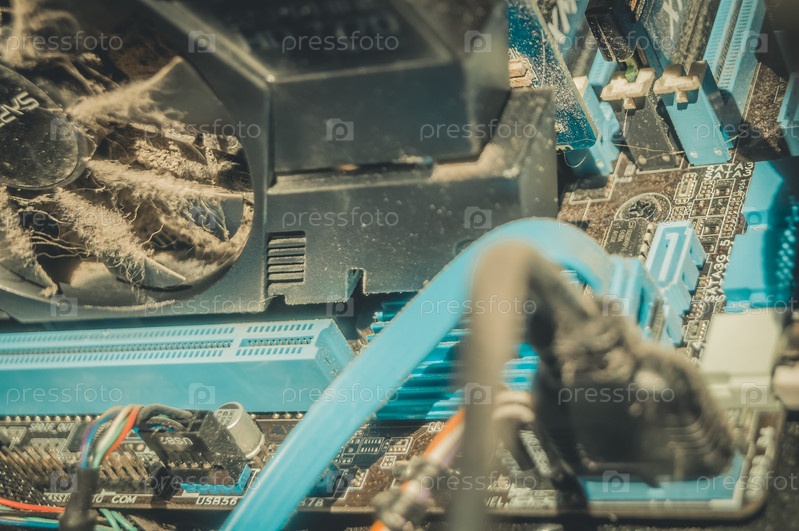 Очень пыльный компьютер. Слой пыли и грязи на деталях системного блока настольного компьютера. Выборочный фокус