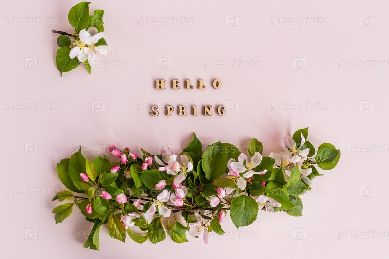 Плоская планировка ветки цветения яблони на белом фоне. Белые цветущие бутоны вид сверху шаблон длинный веб-баннер. Скопируйте дизайн макета космического фона