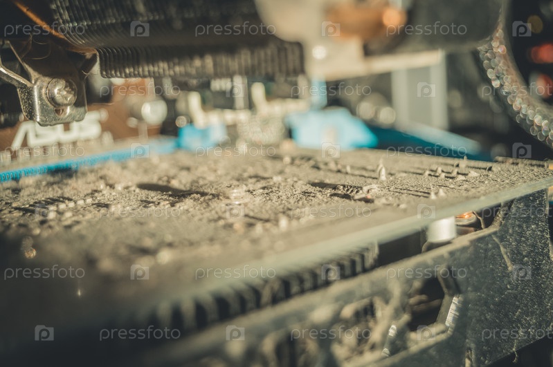 Пыльная компьютерная видеокарта. Слой пыли и грязи на плате. Выборочный фокус