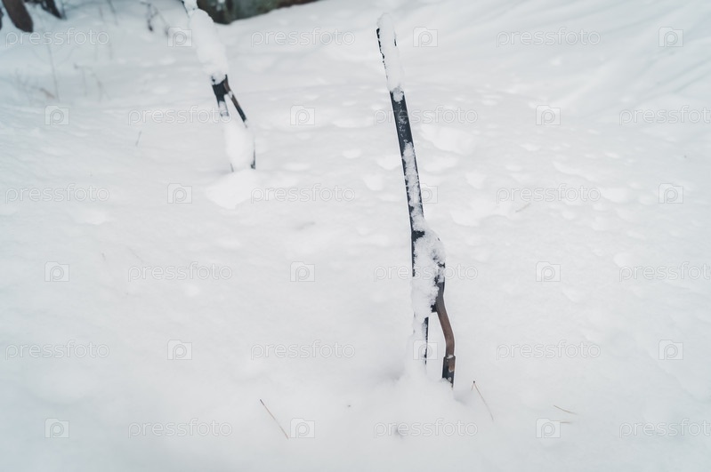 Щетки лобового стекла автомобиля торчат из-под снега. Сильно засыпанный снегом автомобиль. Дворники. Выборочный фокус, снежное зерно