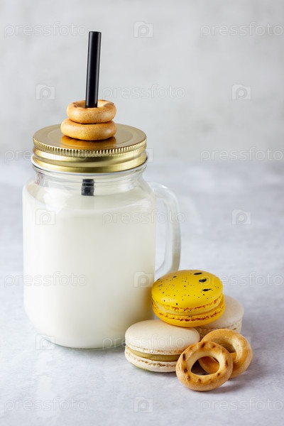 Запеченные рогалики, миндальное печенье и молоко в банке каменщика на столе