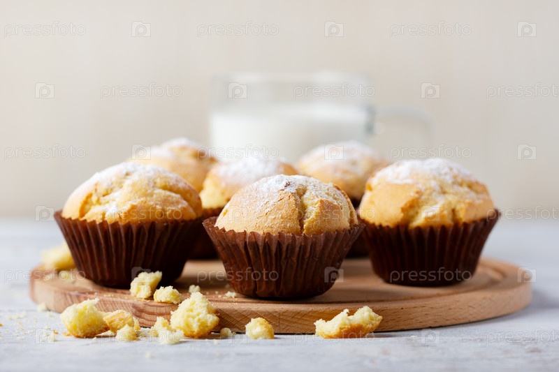 Вкусный сладкий завтрак, домашняя выпечка. Свежеиспеченные домашние кексы в коричневых бумажных стаканчиках и стакан молока на белом деревянном столе
