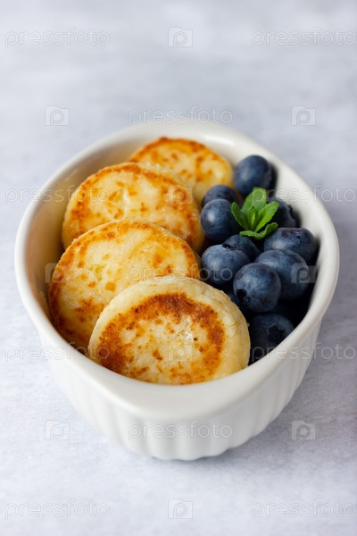 Блинчики с творогом на светлом фоне. Сырники со свежей черникой. Блины с творогом на белом блюде