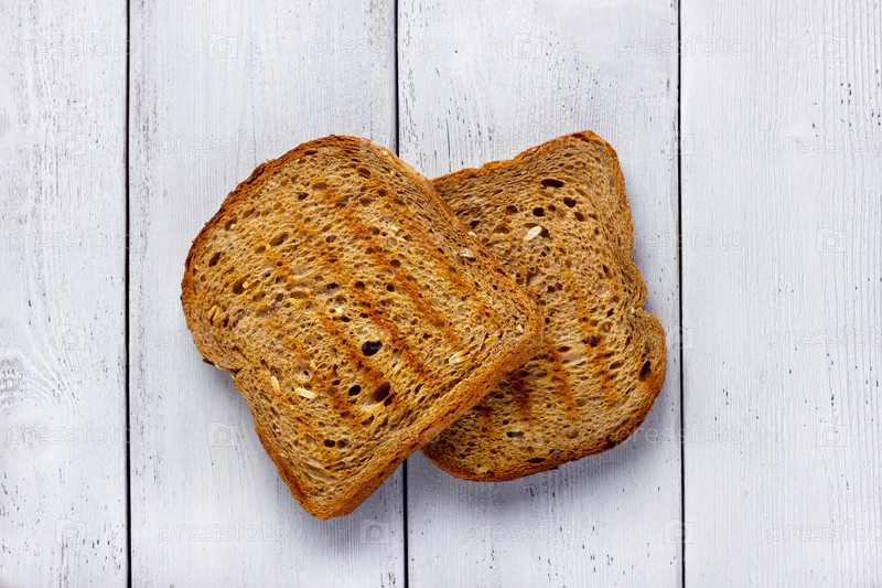 Поджарьте ломтики цельнозернового хлеба на деревянном белом фоне