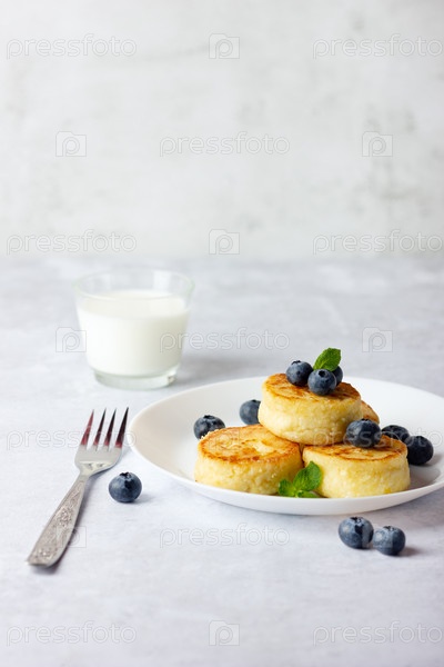 Сырники, сырники, творожные оладьи со свежей черникой и молоком на светлом фоне. Скопируйте место для вашего текста