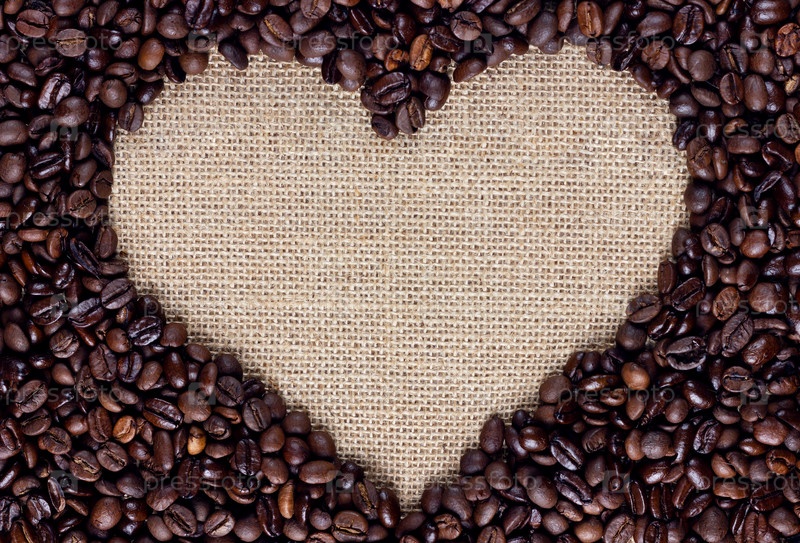 Каркас сердца из кофейных зерен на текстуре мешковины