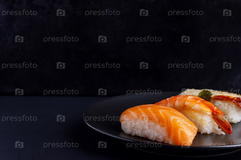 Суши нигири на черном фоне, традиционная японская еда