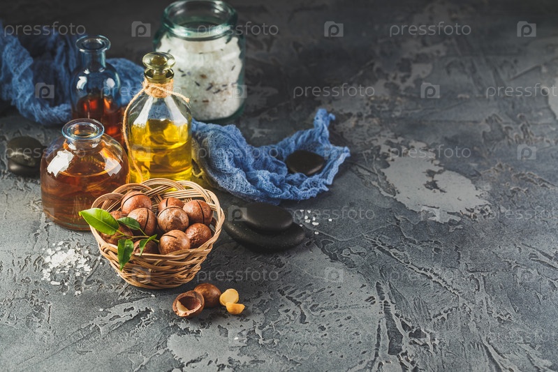 Натуральное масло макадамии в стеклянной бутылке с орехами макадамии