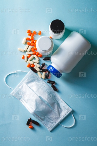 Бутылка и таблетки на синем фоне, вид сверху. Концепция аптеки здравоохранения. Корона вирус