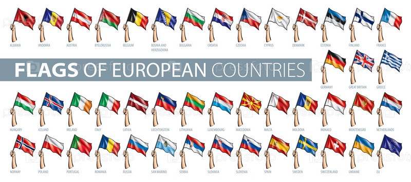 Рука и национальный флаг. Векторная иллюстрация набора европейских флагов