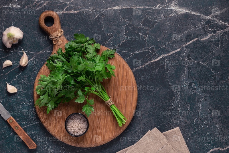 Разделочная доска, петрушка на мраморном столе