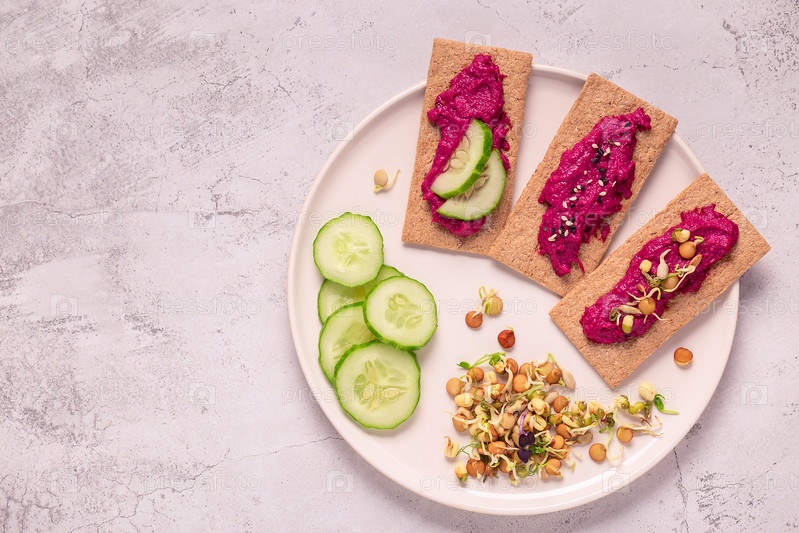 Свекольный хумус, пророщенные зерна, огурец и цельнозерновые чипсы
