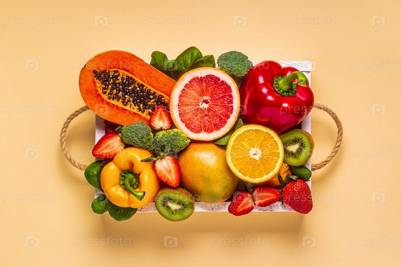 Фрукты и овощи, богатые витамином С, в коробке. Здоровое питание