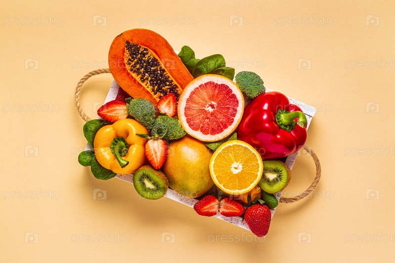 Фрукты и овощи, богатые витамином С, в коробке. Здоровое питание