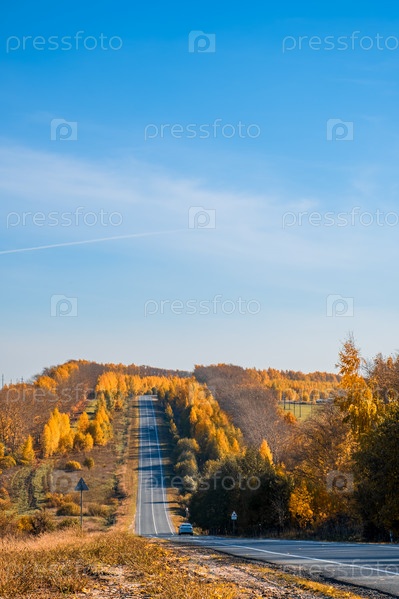 Дорога через красивый цветной осенний лес и поля