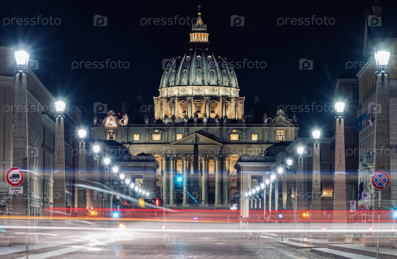 Собор Святого Петра в Риме вечером. Ночная съемка