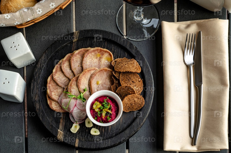 Закуска из языка с гренками и хреном на темном фоне