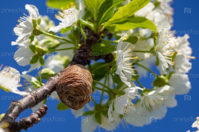 Кокон (оотека) богомола на цветущей ветке крупным планом