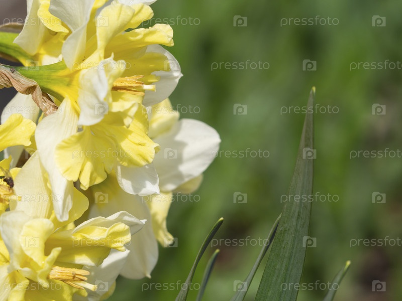Нарциссы в естественном солнечном свете на фоне травы. На клумбе цветут желтые нарциссы. Букет нарциссов в утреннем свете. Малая глубина резкости
