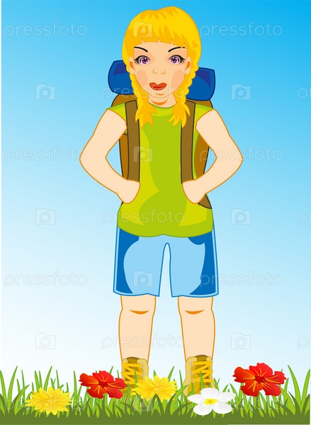 Векторная иллюстрация девушки туриста на поляне года с цветком