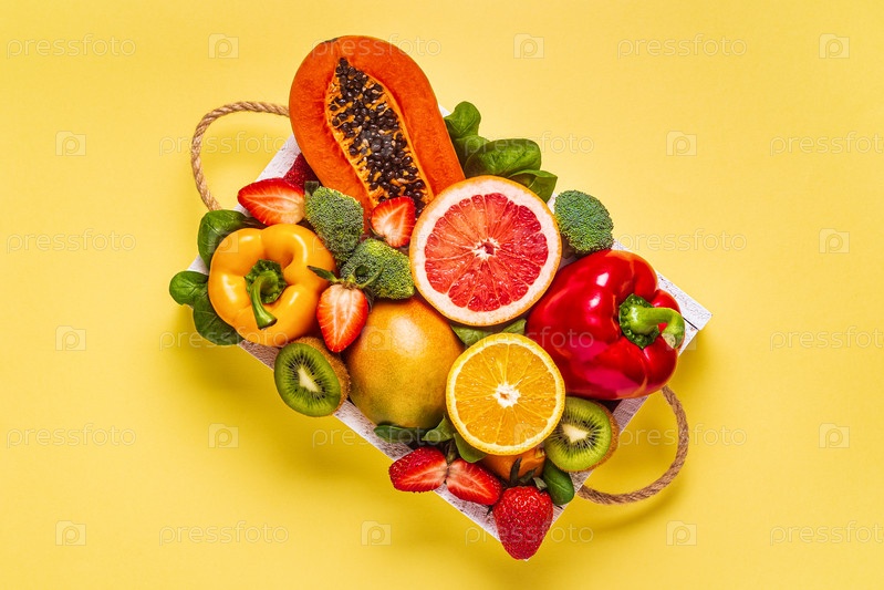 Фрукты и овощи, богатые витамином С, в коробке. Здоровое питание