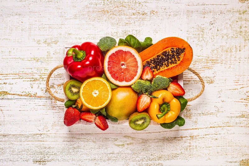 Фрукты и овощи, богатые витамином С, в коробке. Здоровое питание