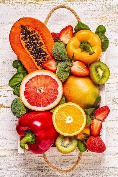 Фрукты и овощи, богатые витамином С, в коробке. Здоровое питание