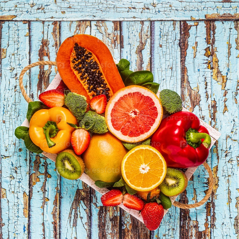 Фрукты и овощи, богатые витамином С, в коробке. Здоровое питание