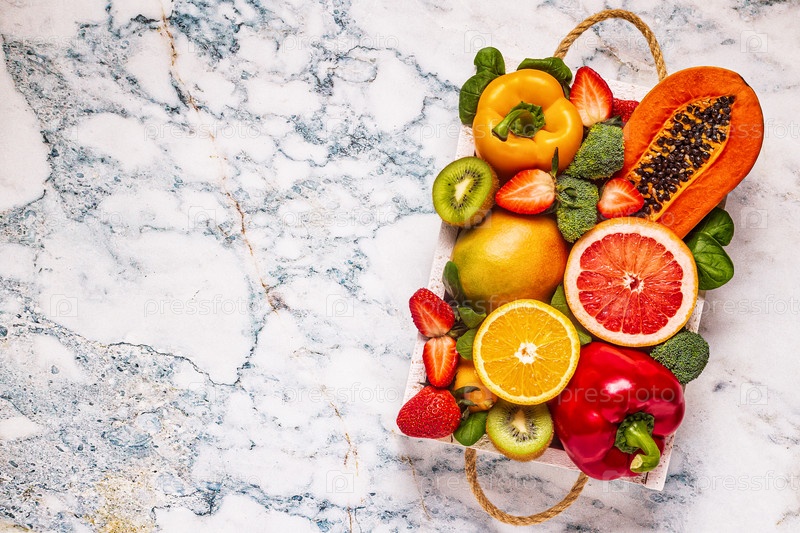 Фрукты и овощи, богатые витамином С, в коробке. Здоровое питание
