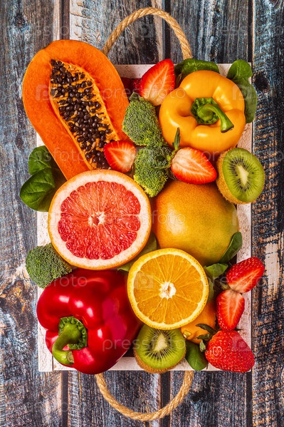 Фрукты и овощи, богатые витамином С, в коробке. Здоровое питание