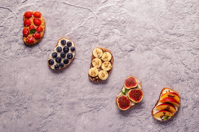 Домашний летний тост со сливочным сыром, ореховым маслом и фруктами и ягодами