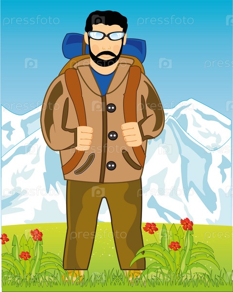 Векторная иллюстрация красочного пейзажа и мужчин с рюкзаком
