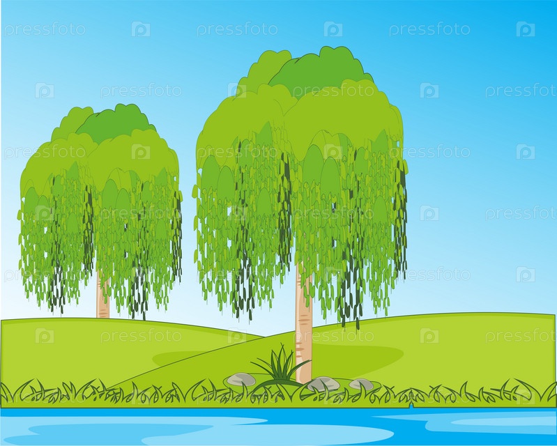 Летний пейзаж дерево ивняк на берегу спокойный двор