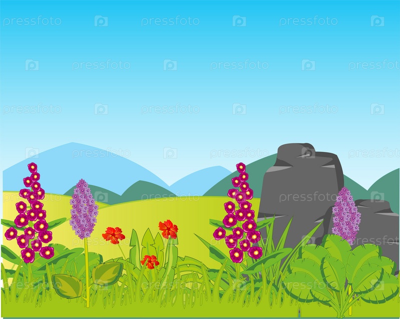 Летняя пейзажная поляна с растениями и далекими горами