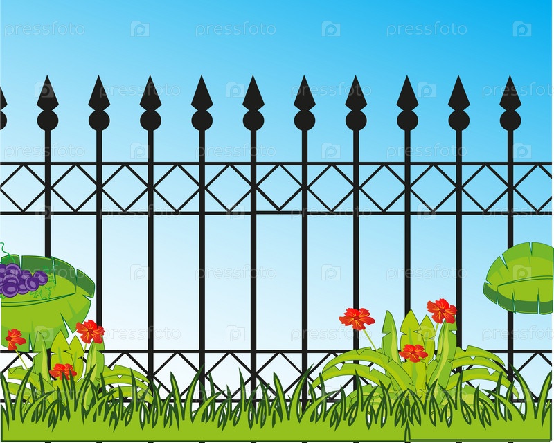 Железный кованый декоративный забор и летняя природа
