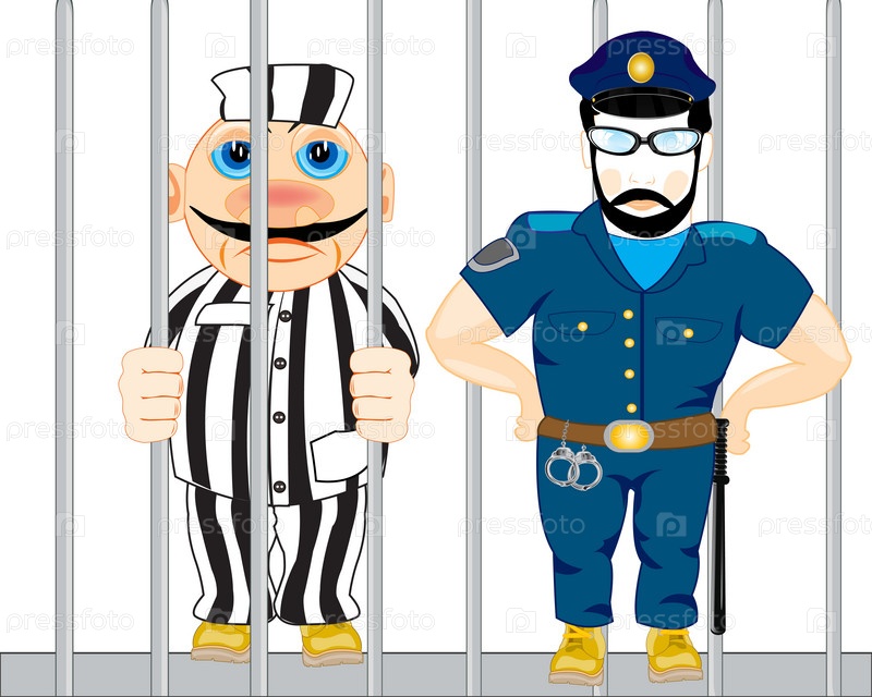 Мультфильм заключен для решетки и полицейского охранника