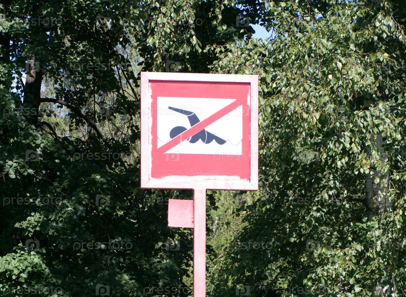 Запрещающий купаться знак в летний солнечный день