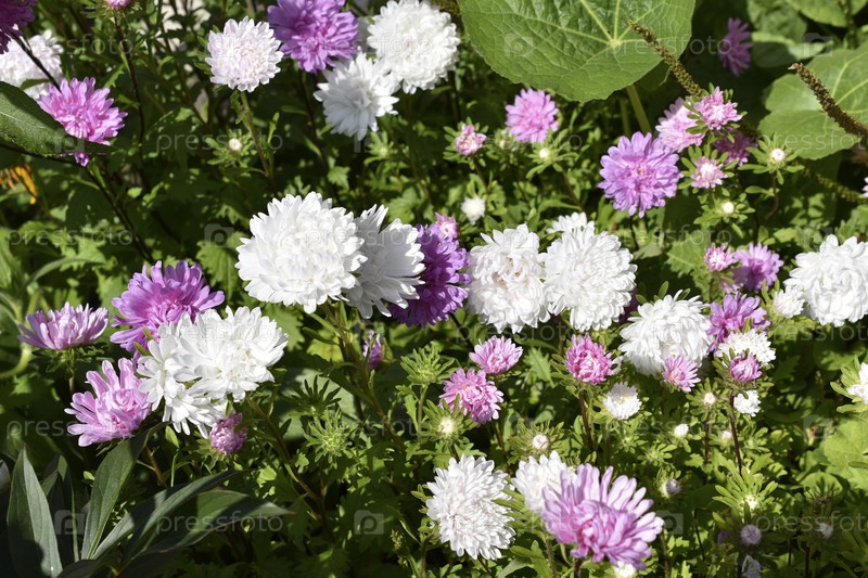 Красно-белые цветы астры сложноцветные в саду
