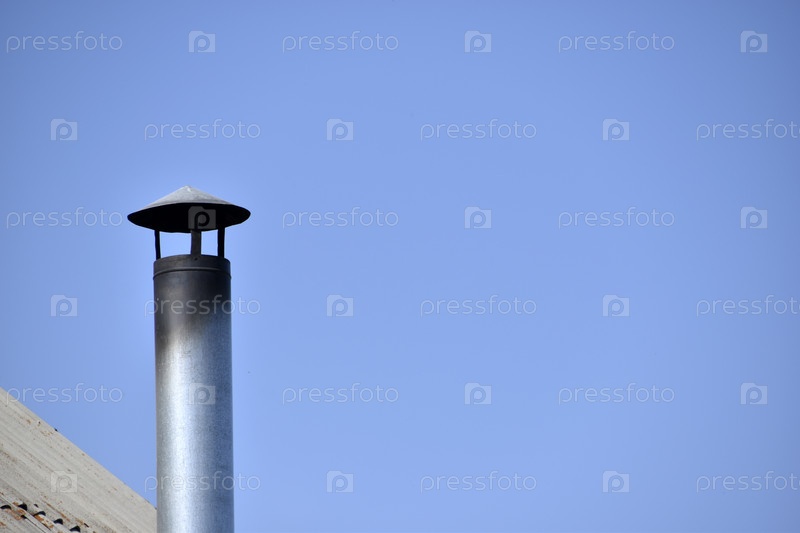 Серебряная печная труба в доме на фоне голубого неба
