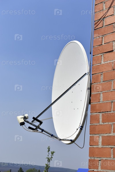 Белая спутниковая тарелка на фоне голубого неба